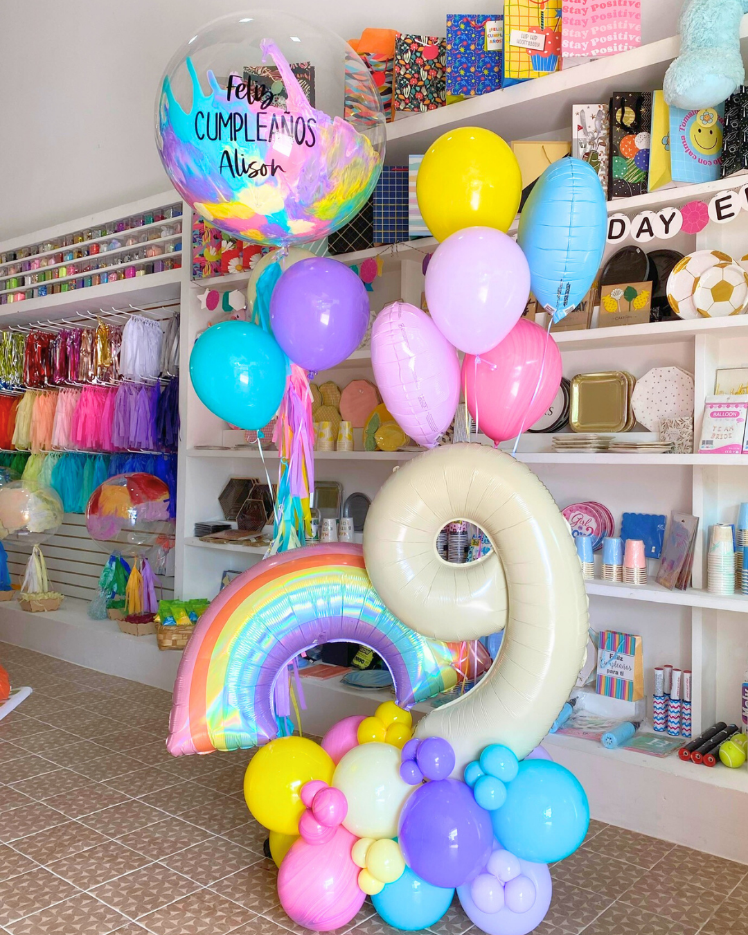 Arreglo número con base y arcoíris.  Un arreglo de 2 corazones, 3 látex y otro arreglo de burbuja jumbo con 3 látex